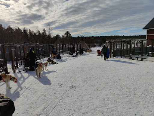 We are a small family owned company based in a remote area about 15 km south of Kiruna town. Life revolves around our 40 Huskies. Typically when you arrive at the yard you see our dogs running free and happy to greet you. Our Dogs are family! They are well taken care of all year around from puppy paws on, as eager athletes, until their well-deserved retirement.